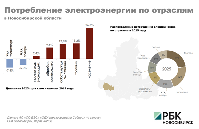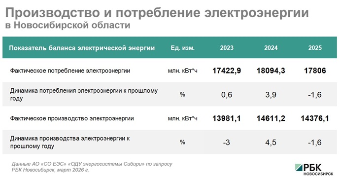 Новосибирская область является планово дефицитной по электричеству: производство электроэнергии меньше, чем потребление, часть потребностей региона закрывается перетоками из энергосистем соседних регионов. Так, по итогам 2025 года доля сальдо перетоков в Новосибирскую область составила 19%, за год этот показатель не изменился.