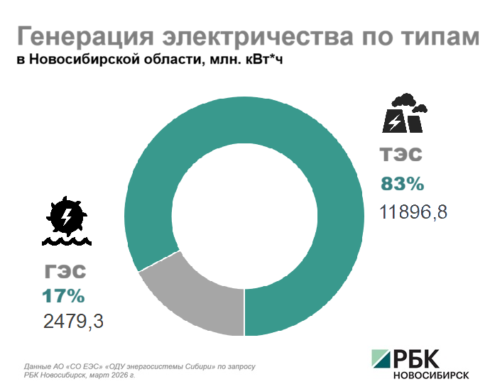 Выработка электрической энергии на электростанциях в 2025 году составила 14,4 млрд кВт·ч. Две трети электричества в регионе вырабатывается на ТЭС, треть — на ГЭС. При этом в прошлом году Новосибирская ГЭС выработала 2 479 млн кВт·ч, что на 28% выше среднемноголетних значений. Это стало абсолютным рекордом за весь период работы гидроэлектростанции. В целом 2025 год характеризовался повышенной водностью, что позволило увеличить долю энергии ГЭС.