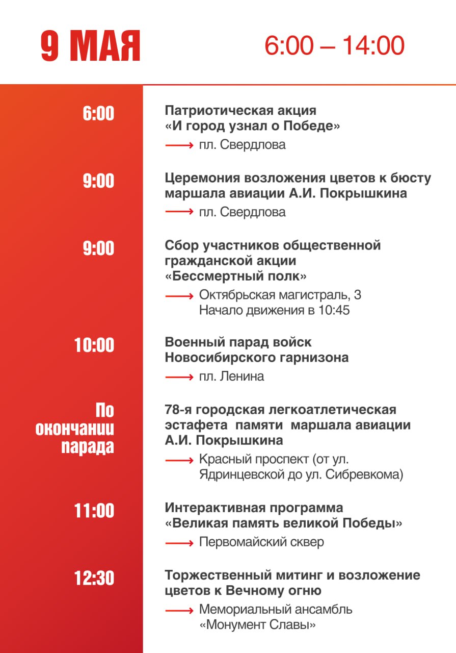 Парад Победы пройдет 9 мая в 10:00. После парада состоится 78-я городская легкоатлетическая эстафета памяти маршала А.И. Покрышкина. Маршрут эстафеты пройдет по Красному проспекту: от ул. Ядринцевской до ул. Сибревкома. В 12.30 стартует торжественный митинг, возложение венков и цветов к Вечному огню на Монументе славы.
