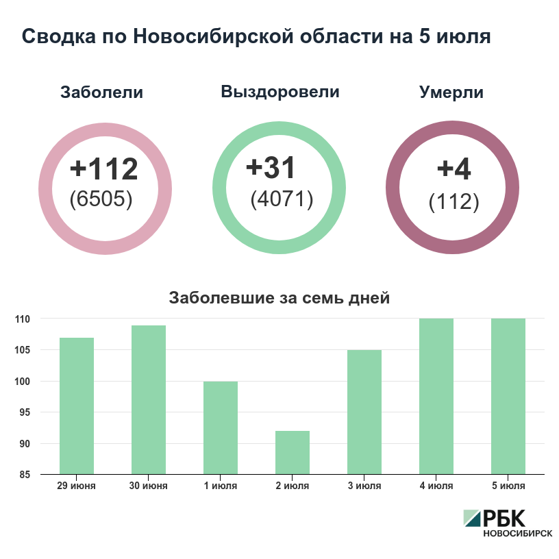 - По данным на 5 июля в Новосибирской области выявлено 112 новых случаев заболевания COVID-19, сообщили в оперштабе. Выздоровел 31 человек. Умерли четверо: двое мужчин в возрасте 58 лет, 71 год и 77 лет и женщина, ей было 58 лет.