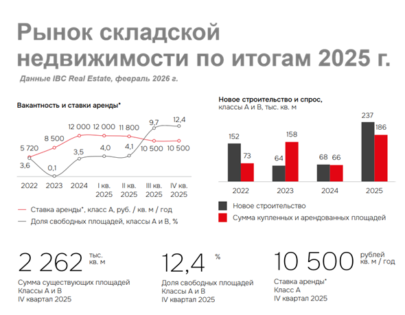 Аналитики IBC Real Estate отмечают, что весь 2026 год рынок складской недвижимости будет находиться в условиях сокращения издержек на фоне сдержанного спроса.В числе факторов, оказывающие влияние на рынок - минимальные темпы роста экономики, переход в режим экономии со стороны потребителей на фоне роста цен и замедления темпов роста доходов. Рост издержек собственников и девелоперов провоцирует увеличение налоговой нагрузки, высокая стоимость заемного финансирования.