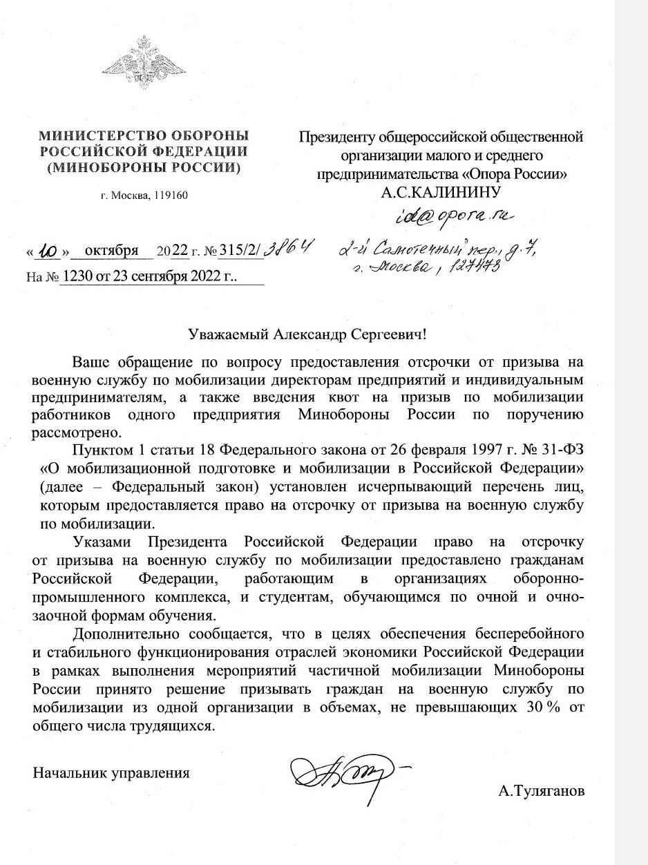«Мы ждем ответа по отсрочкам от частичной мобилизации для физлиц-учредителей, генеральных директоров, главных бухгалтеров компаний вне зависимости от отрасли и формы собственности, ИП и для руководителей фермерских хозяйств, — отмечает Салов. — Если вы столкнетесь с фактами превышения 30% квоты при мобилизации на вашем предприятии, то берите это письмо и обращайтесь в прокуратуру».