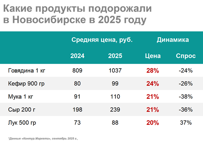 По данным исследования стоимости продуктовой корзины, проведенной аналитиками «Контур.Маркета», за год в Новосибирской области сильнее всего поднялась в цене говядина (28%), кефир (24%), мука и сыр (21%).