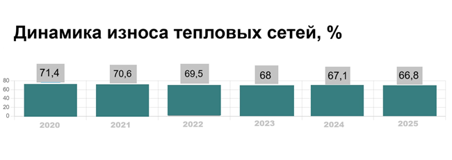 «Постепенно снижаем степень износа на трубопроводах старше 25 лет. Если в 2020 году доля таких теплосетей составляла 71,4%, то по итогам 2025 года этот показатель должен снизиться до 66,8%», — рассказал Дмитрий Перязев.