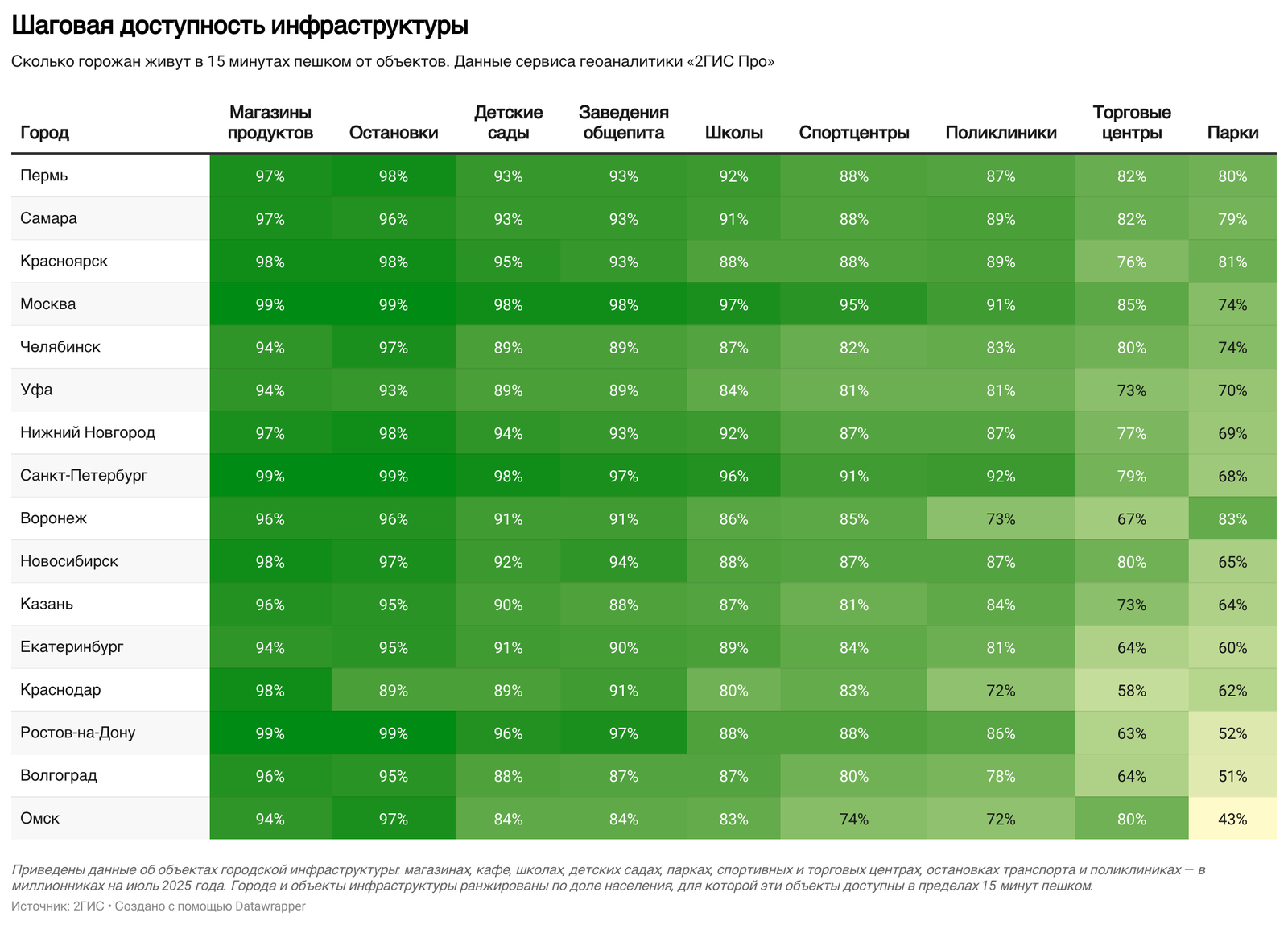 Наиболее высокая доля горожан, живущих в 15 минутах от ключевой городской инфраструктуры, — в Самаре, Перми (по 71% жителей) и Красноярске (66%).
